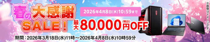 | 春のパソコンセール | 3月27日11:00~4月10日10:59まで | 最大50,000円値下げ |