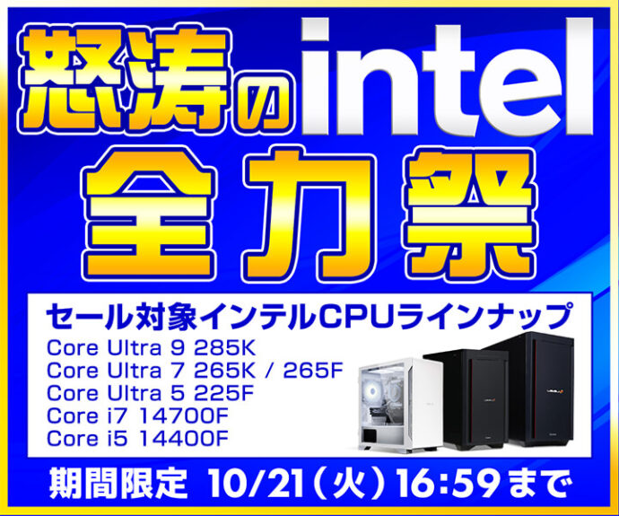 パソコン工房では過去に怒涛の半期決算セールとして9月30日16時59分まで実施。現在は怒涛のIntel全力祭セールを10月21日16時59分まで開催中。